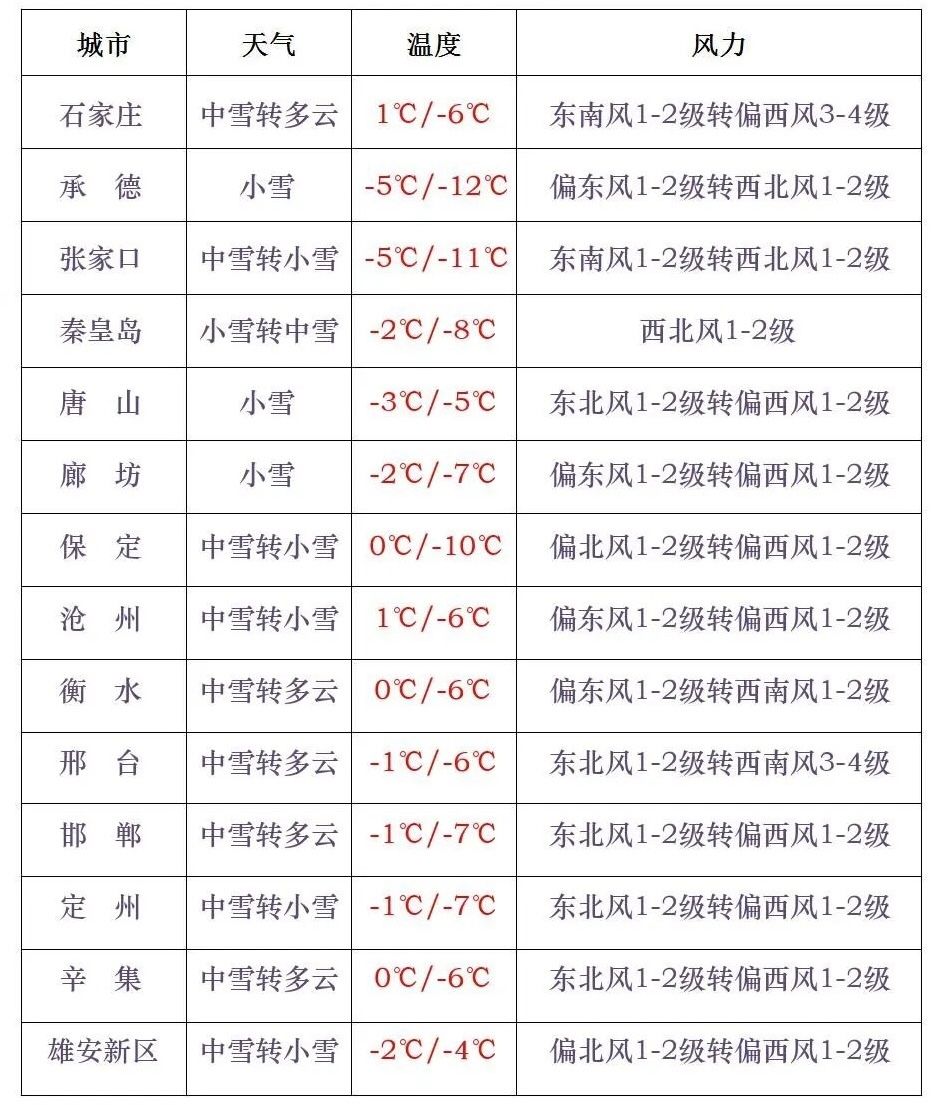 今天白天,全省阴,承德、唐山、秦皇岛有小雪,其他地区有中雪,局地有大雪。今天夜间到明天,保定、石家庄、邢台、邯郸四个地区的西部多云转晴,其他地区阴有小雪转多云,局地有中雪。13-14日早晨,全省最低温持续下降,大部分地区下降4~6℃,其中张家口、承德、邢台、邯郸等地的部分地区下降7~10℃。
