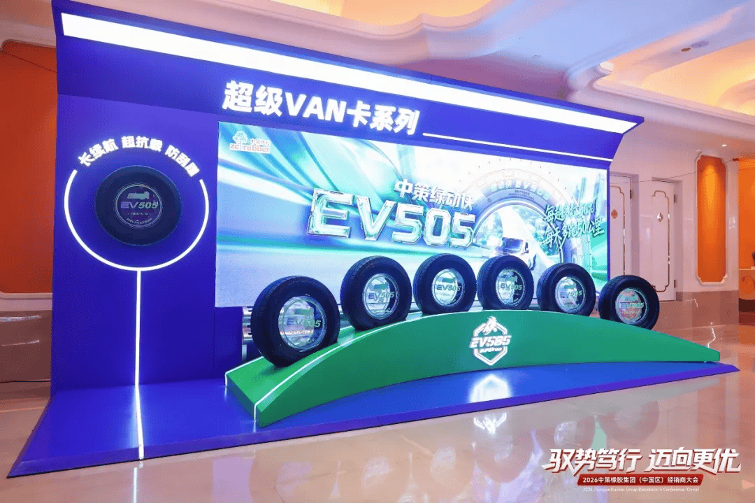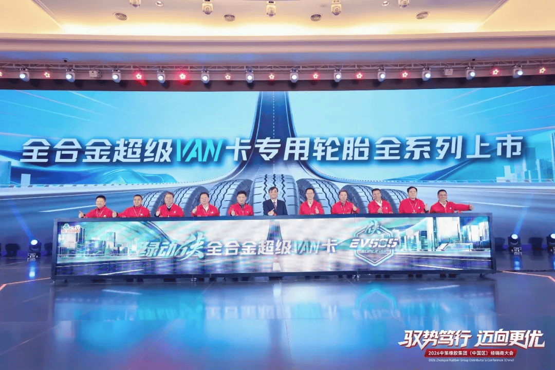 商用车轮胎领域,此次超级VAN卡专用轮胎EV505继全球首条下线后,再临全规格新品重磅上市的高光时刻。现场,沈金荣董事长携集团高级副总经理葛国荣、副总经理蒋志强、轮胎销售公司副总经理丁雨波等工厂领导,与经销商代表一同开启VAN卡专用轮胎的全新时代。