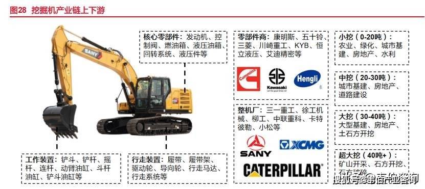 挖掘机下游主要有房地产开发、基础设施建设、采矿业、农业、水利等相关行业。挖掘机根据其吨位可分为超大挖、大挖、中挖、小挖。