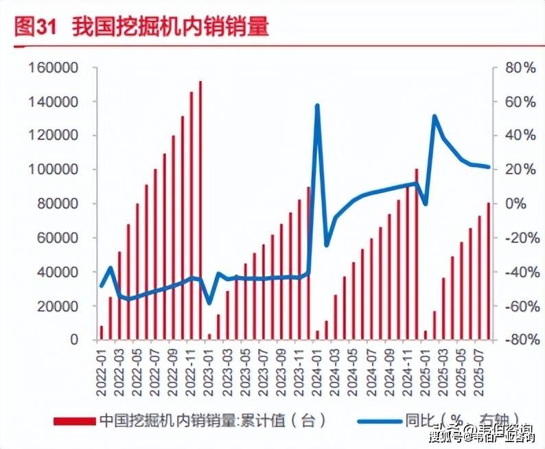 挖掘机内销复苏提速。根据国内销售数据,2025 年1-8月,国内挖掘机内销累计 80,628台,同比增长 2150%,复苏态势强劲。