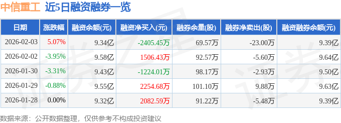 中信重工融资融券信息显示,融资方面,当日融资买入4509.86万元,融资偿还6915.31万元,融资净偿还2405.45万元。融券方面,融券卖出2.41万股,融券偿还25.41万股,融券余量69.57万股,融券余额533.6万元。融资融券余额9.39亿元。