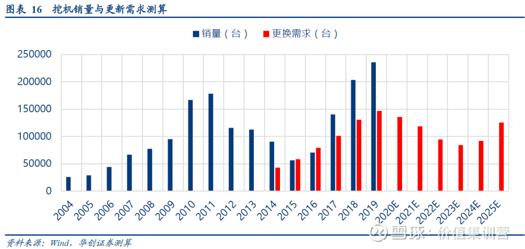 通常挖掘机寿命为8-10 年,上一轮行业2010-2011年销量高峰的设备在2016年开始陆续进入更新换代阶段,2019-2021年为挖掘机的更新高峰期。