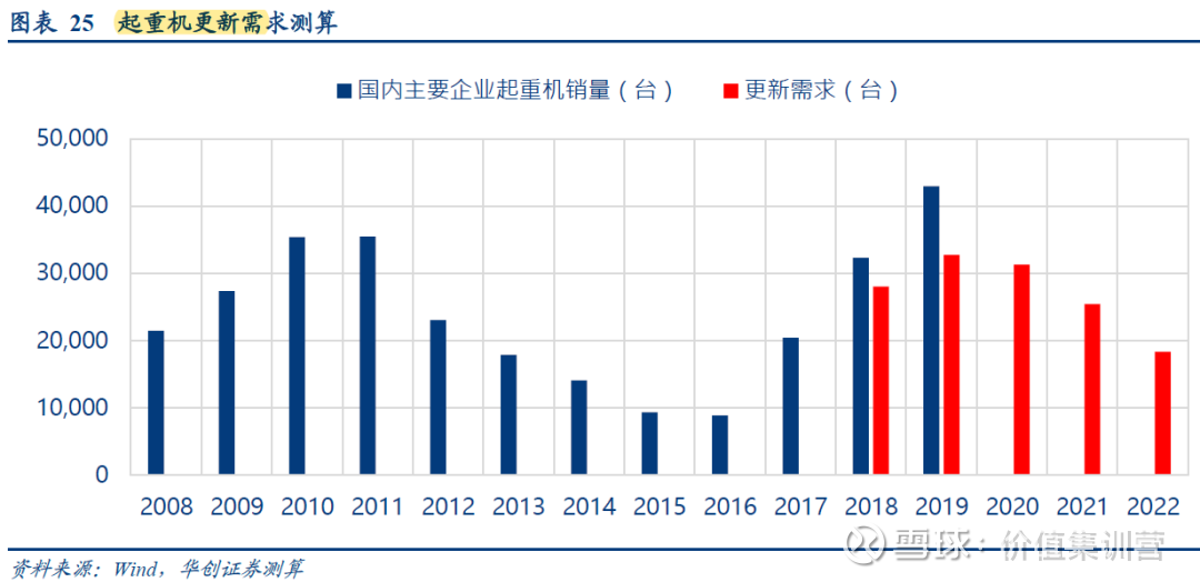 起重机主要用于设备吊装、材料跨区域及跨高度搬运等,与基建投资的相关性较高。起重机寿命通常为8-10 年,机构测算2018-2021年将迎来更换高峰。