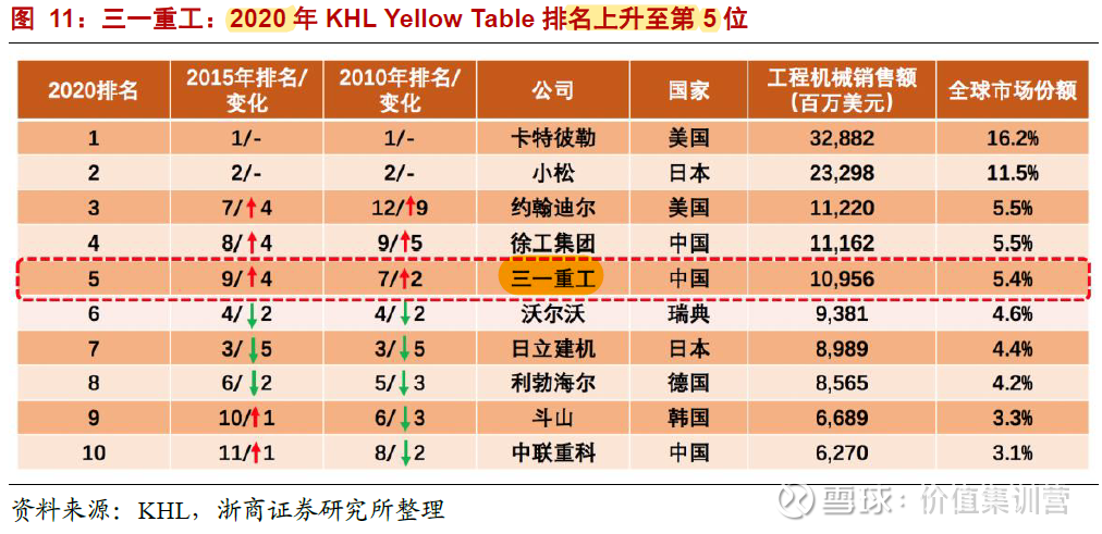 三一重工作为国内工程机械的龙头企业。2020年,三一重工以109亿美元销售额位列全球工程机械第5位,占全球市场份额5.4%。