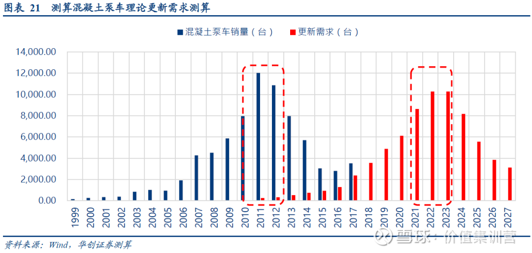 混凝土机械主要用于房地产和大型建筑项目等,一般会晚于挖机、起重机进场施工,需求呈现后周期特性。混凝土泵车的更新周期约为10-12 年,机构测算混凝土机械的更新高峰会在2021~2023年。
