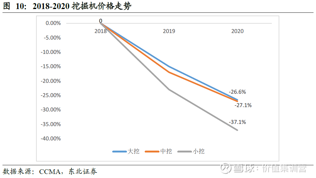 (1)价格下降。工程机械产品单价在几十万元至千万元之间。近年来,挖机价格持续向下走,其中小挖下降幅度达到40%左右,中大挖的降幅也达到20%-30%。