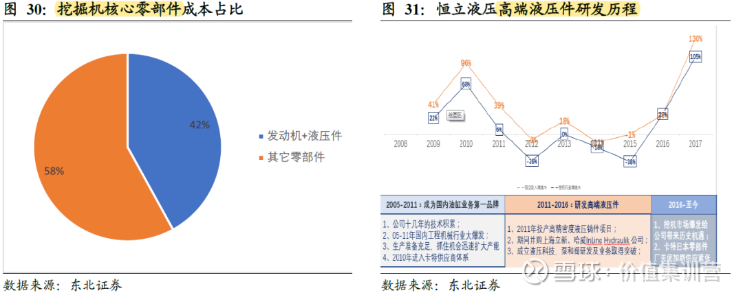 (3)核心零部件突破。核心零部件是工程机械占比最大的成本部分。以挖掘机为例,仅液压系统和发动机系统两项成本就占据挖掘机成本的40%以上,而这两部分很长一段时间都依赖于进口。在过去,国内工程机械企业要长期承受核心零部件的国外供给限制瓶颈以及定价权丧失之痛,与外资品牌竞争中处于弱势。随着恒立液压等高端液压件突破,推动工程机械行业实现自主可控,加速工程机械的国产替代。