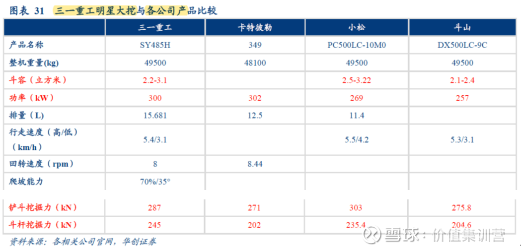 (2)性能提升。中国工程机械产品整体性能和品质已不输国际龙头。以技术含量最高的大挖为例,三一的大挖明星产品SY485H大型液压挖掘机在功率、斗容、铲斗挖掘力等关键指标上已经不输给卡特彼勒、小松、斗山等国际品牌的相同定位产品。