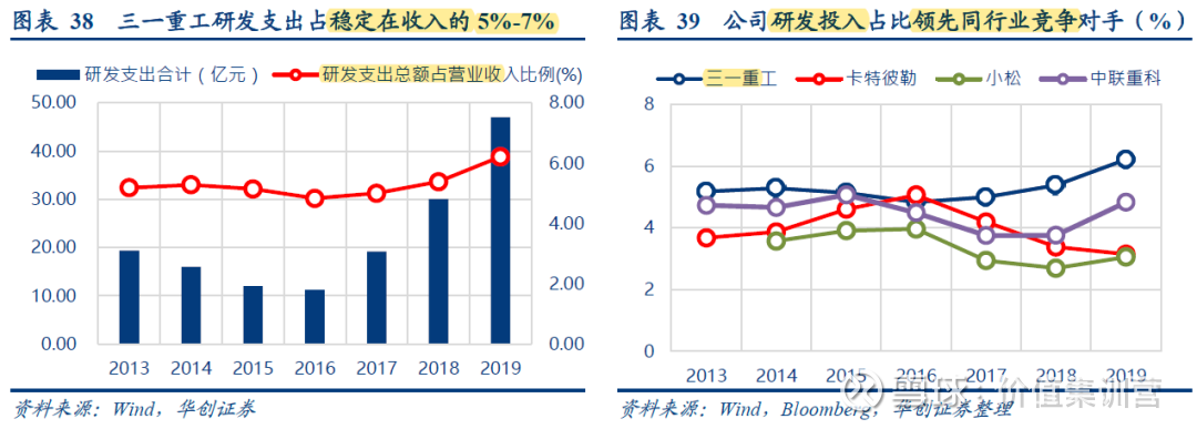 (4)研发优势。三一每年将销售收入的5%-7%用于研发。2019年,三一研发费用占收入的比重达到6.2%,是卡特彼勒和小松的2倍。巨额研发投入下,三一的工程机械相关专利申请及授权数也位居国内行业第一。