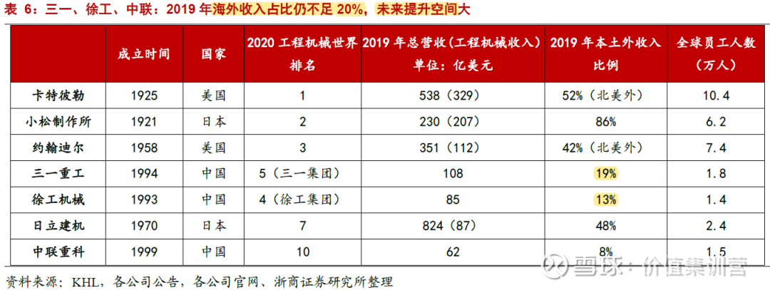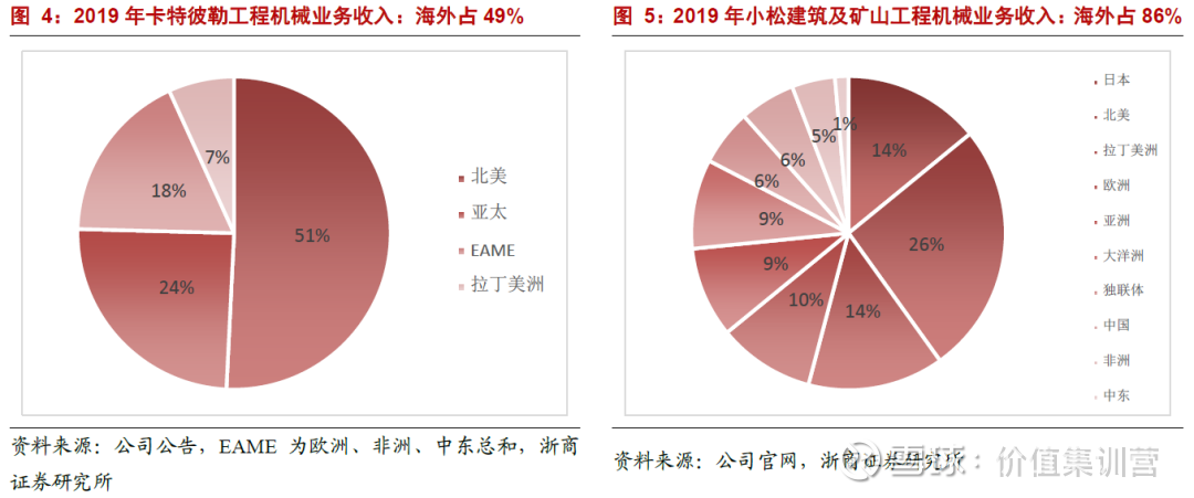 (1)全球布局。2018 年全球工程机械销售额约1100亿美元,中国占比约为23%,77%的市场空间在海外。2019年,卡特彼勒工程机械的海外业务占比高达49%,小松建筑及矿山工程机械业务的海外收入占比高达86%。
