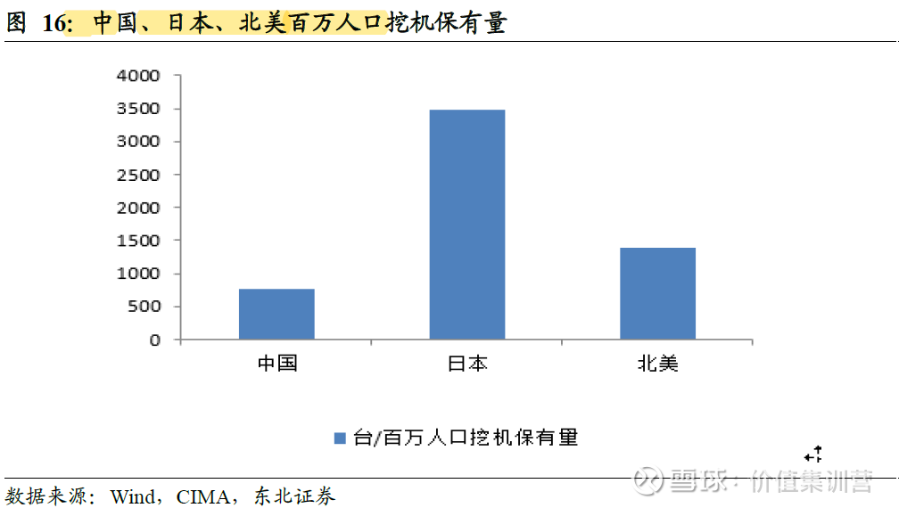 (2)保有量提升。中国、日本、北美三个地区的每百万人口的挖机保有量台数分别为758台、3471台、1381台,国内挖机的保有量仍然有较大提升空间。