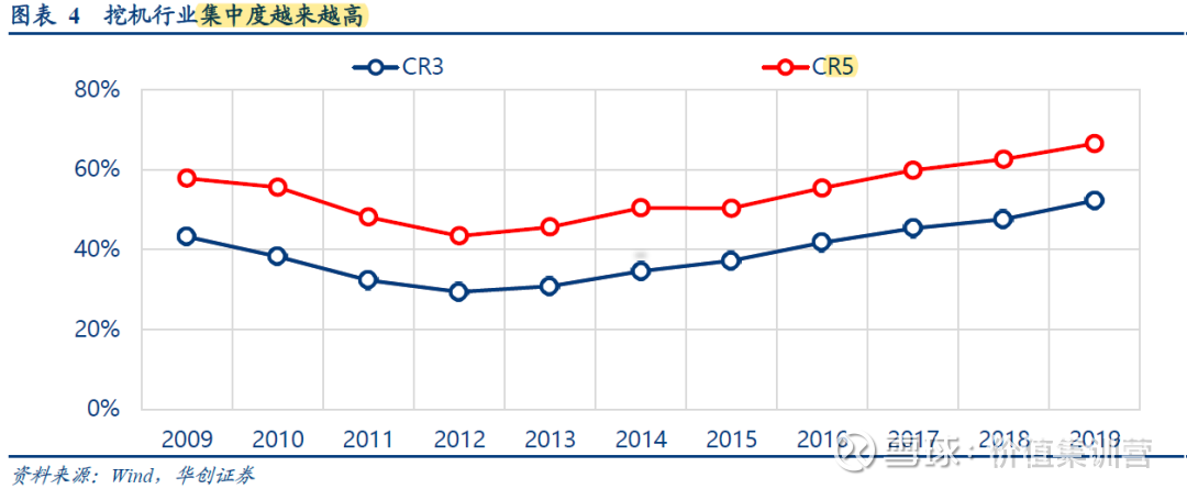 (3)集中度提升。2012年以后,在“去产能”背景下,大量缺乏核心技术的中小工程机械企业均被淘汰,2019年国内挖机前三强市占率已经达到52%,集中度还有继续提高空间。